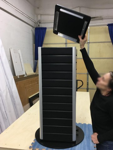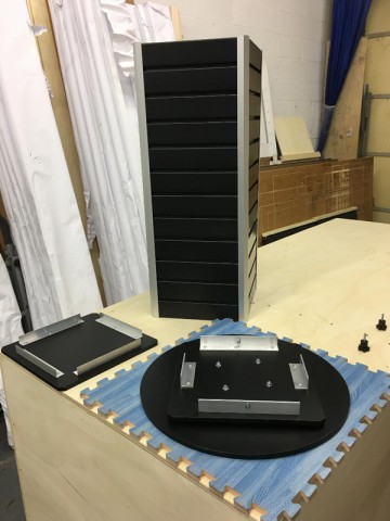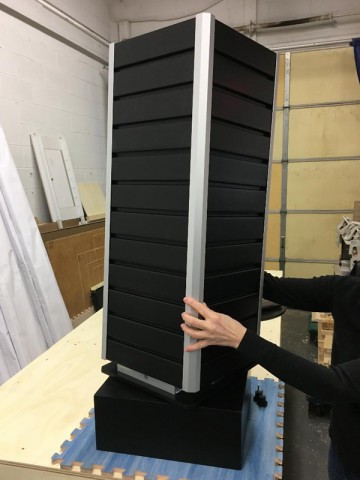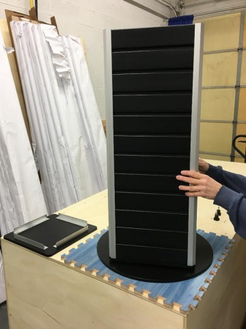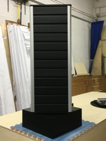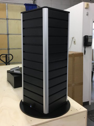 ADD Rotating bases allowing Clients to view all sides of tower by spinning the slat wall section of the tower around. Base stays stationary and your Slat Wall Tower rotates 360 Degrees |