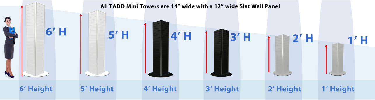 TADD Mini Slat Wall Towers- Needing a solution for your smaller merchandise or display products without compromising on design or style? TADD Innovations has the answer, our Superior quality Mini slat wall towers. Build your own, all towers are 14" wide with slat wall displaying area 12" wide. Plenty of room to display smaller items! Start by choosing your height, choice of PVC or Aluminum slat wall panels, pick your base style, stationary or rotating, choose from standard colors to over 100 colors for aluminum slat wall panels, your mini tower will arrive with minimal assembly not like our competitors that supply cheap flake board, MDF, a bag of fasteners and time consuming installation. With our great TADD Products you are ready for displaying. From a full length tower to display various products, towers with bases which put slat wall in optimal level for viewing, to smaller towers made for counters which rotate allowing for eye level product displaying we have the solution you need! Easy no tool assembly, lightweight and durable, the TADD Mini Towers are 14" wide with various heights to accommodate your small products. Slat wall mini towers display are perfect for your next trade show, sales promotion, presentation, product launch, pop up store or any event! Attractive trade show display Towers with custom add ons and slat wall to organize all your products.....all on budget! No one beats our customer service and quality. Set Up Made Simple! |
